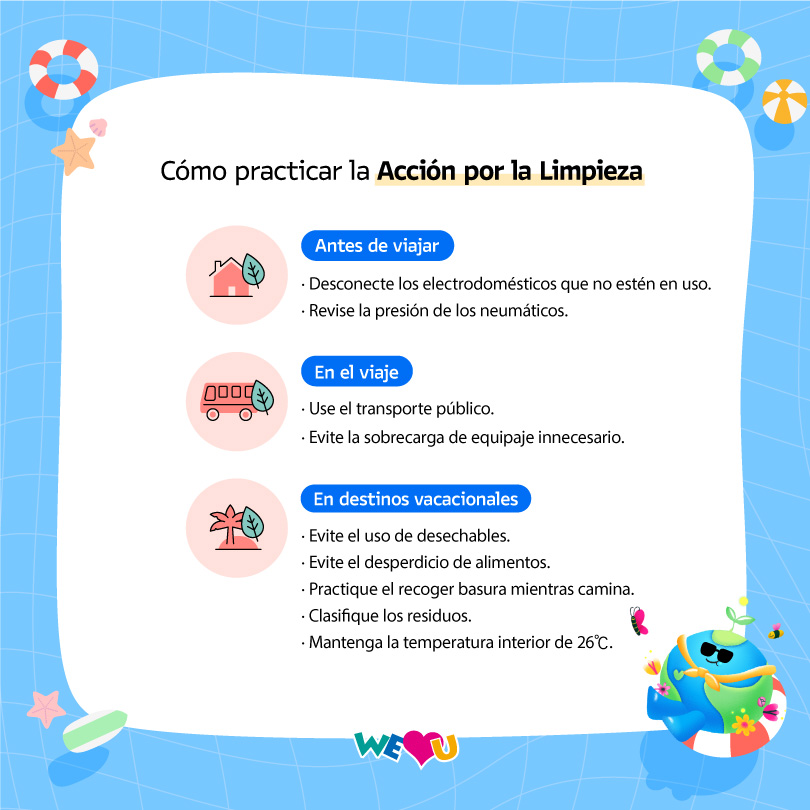 Mi familia participó en la Campaña de Acción por la Limpieza en el destino vacacional de este verano. Antes de irnos, desconectamos todos los electrodomésticos que no usaríamos. Cuando llegamos al hotel, usamos solo utensilios reutilizables y comimos todo lo que preparamos sin dejar sobras. Pasamos unas vacaciones significativas haciendo actividades pequeñas pero valiosas para proteger el medio ambiente con toda nuestra familia.