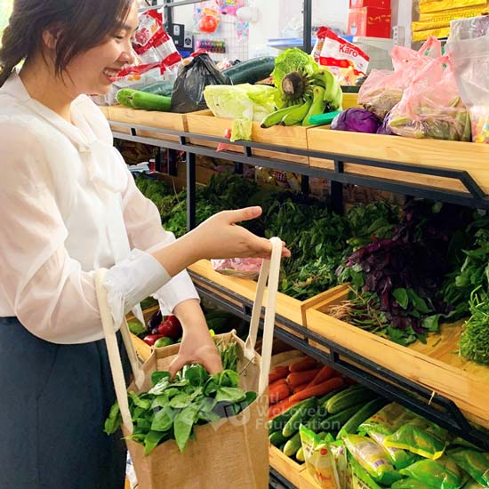 Cuando voy a mi ciudad natal, uso esta bolsa para ir de compras. No es elegante, pero sí resistente y amigable con el medio ambiente. A medida que los desechos plásticos se desbordan y la temperatura global aumenta, la ciudad de Hanói hizo esta bolsa como parte de una campaña ambiental. Hoy, usé esta bolsa al comprar verduras.