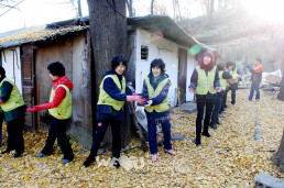 Las casas que usan el sistema de calefacción convencional —briquetas de carbón— están juntas en la aldea Nokcheon, pero las familias que están en peor situación ni siquiera pueden comprar briquetas de carbón. Para ellos, llevaron carretillas cargadas de briquetas para entregárselas, y en caminos angostos donde era más difícil el transporte de las carretillas, hicieron una fila y pasaban las briquetas de carbón de persona a persona. El jefe de la aldea Nokcheon, Kim Sun-cheol (65 años), expresó su gratitud a los miembros con las palabras: “Agradezco que hayan venido. Siento ganas de arrodillarme delante de ustedes”.