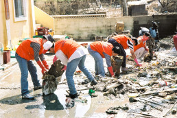 Eliminando la suciedad por todas partes y lavando la ropa manchada con barro, los miembros sonreían en todo momento y animaban a las víctimas.